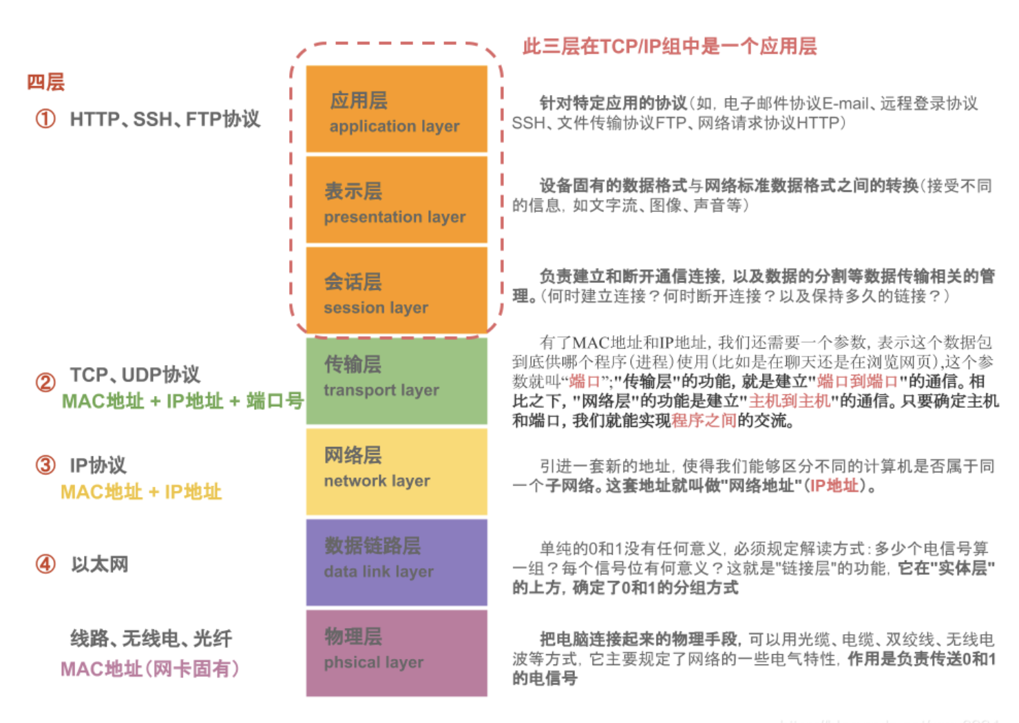 - 物理层 - 最底层,定义物理介质上的比特流传输。