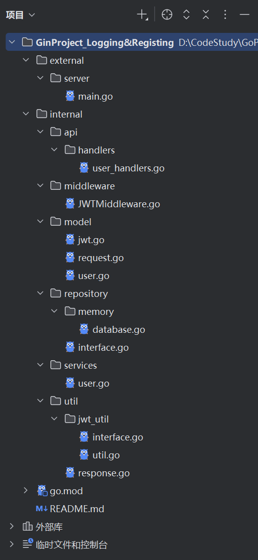 | GinProject_Logging&Registering/ ├── api/ │ ├── dao/ │ │ ├── cache/ │ │ │ ├── interface.go │ │ │ └── redis.go │ │ ├── memory/ │ │ │ └── database.go │ │ └── mysql/ │ │ ├── courses_mysql.go │ │ ├── database.go │ │ ├── todo_mysql.go │ │ └── user_mysql.go │ ├── handlers/ │ │ ├── courses_handlers.go │ │ ├── todo_handlers.go │ │ └── user_handlers.go │ └── services/ │ ├── courses.go │ ├── todo.go │ └── user.go ├── cmd/ │ └── main.go ├── internal/ │ ├── config/ │ │ └── config.go │ ├── middleware/ │ │ └── JWTMiddleware.go │ ├── model/ │ │ ├── courses.go │ │ ├── jwt.go │ │ ├── request.go │ │ ├── todo.go │ │ └── user.go │ └── util/ │ └── jwt_util/ │ ├── interface.go │ ├── util.go │ ├── password.go │ └── response.go ├── .env ├── .gitignore ├── go.mod ├── go.sum └── README.md